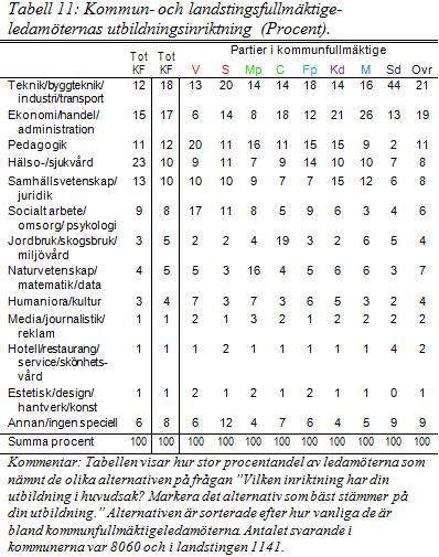 I enkäten frågade vi också ledamöterna om vilken inriktning deras utbildning har. I frågan specificerades inte att det måste röra sig om högre utbildning och även de flesta med gymnasial utbildning eller motsvarande svarade på denna fråga. I Tabell 11 redovisas hur stor andel av de folkvalda i kommuner och landsting som har olika typer av inriktningar på sin utbildning. Bland kommunpolitikerna redovisas även motsvarande resultat för ledamöterna från de olika partierna.