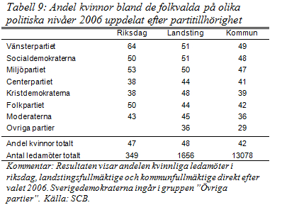 Under valperioden 2006-2010 är andelen kvinnor omkring 47-48 procent i riksdag och i landstingsfullmäktige, och 42 procent i kommun¬fullmäktige. På samtliga nivåer är det Vänsterpartiet som har den högsta andelen kvinnliga ledamöter. I riksdagen har Vänsterpartiet 64 procent kvinnor och i kommunerna 49 procent. I landstingen delar Vänsterpartiet topplaceringen med Socialdemokraterna, där båda partierna har 51 procent kvinnor.